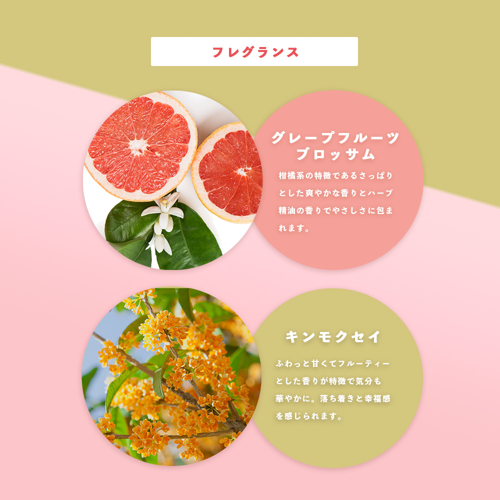| 全成分 | グレープフルーツブロッサム:シア脂、(カプリル酸/カプリン酸)ヤシアルキル、ミツロウ、グレープフルーツ果皮油、アストロカリウムムルムル種子油、テオブロマグランジフロルム種子脂、アルガニアスピノサ核油、ホホバ種子油、メドウフォーム-δ-ラクトン、ヒマワリ種子油、ラベンダー油、ニオイテンジクアオイ油、マンダリンオレンジ果皮油、ローズマリー葉油、トコフェロール<br> キンモクセイ:シア脂、(カプリル酸/カプリン酸)ヤシアルキル、ミツロウ、香料、アストロカリウムムルムル種子油、テオブロマグランジフロルム種子脂、アルガニアスピノサ核油、ホホバ種子油、メドウフォーム-δ-ラクトン、ヒマワリ種子油、ラベンダー油、ニオイテンジクアオイ油、マンダリンオレンジ果皮油、ローズマリー葉油、トコフェロール |
