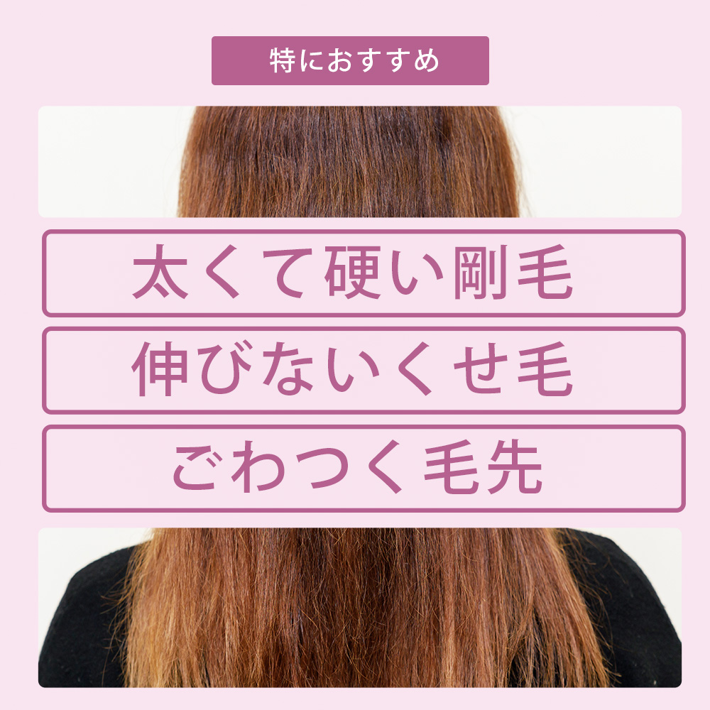 使用方法 シャンプーまたはトリートメント後、タオルドライをした濡れた髪全体になじませるように塗布し、その後ドライヤー等で乾かしてください。洗い流す必要はありません。