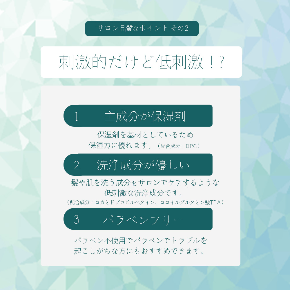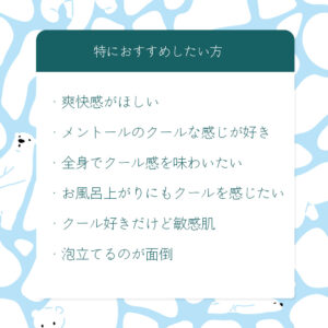 | 全成分 | 水、DPG、コカミドプロピルベタイン、ココイルグルタミン酸TEA、塩化Na、メントール、ラウロイルメチルアラニンNa、ココイルグルタミン酸Na、ココイルグルタミン酸2Na、カンフル、セイヨウハッカ葉エキス、ユーカリ葉エキス、ハッカ葉油、トウガラシ果実エキス、クエン酸、ポリクオタニウム-6、コカミドDEA、エタノール、PPG-5セテス-10リン酸、エチドロン酸、水酸化Na、フェノキシエタノール、安息香酸Na、BG、香料 |